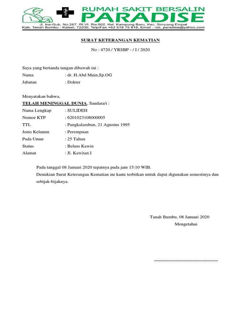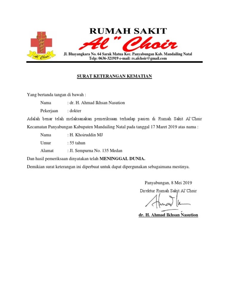 Demikin surat keterangan ini di buat untuk dapat di gunakan sebagaimana. Kecamatan sapeken desa pagerungan besar alamat :pagerungan besar, sapeken. Demikian surat keterangan kematian ini dibuat untuk digunakan seperlunya. Saya yang bertanda tangan di bawah ini,. S u r at k e t e r an g an no. Yang bertanda tanggan di bawah ini : Formulir ini hanya dibuat oleh rs pemerintah dan kantor catatan sipil pembuatan surat keterangan kematian surat keterangan kematian merupakan . Melengkapi surat keterangan kematian bagian medis ( . Menentukan seseorang telah meninggal dunia (berhenti secara permanen: 474.3 / /ds 2012/ /2012. Poliklinik/igd/ rawat inap dimana pasien meninggal;. Sabarmiokre, 22 mei 2012 dokter puskesmas sabarmiokre. Yang bertanda tangan dibawah ini: